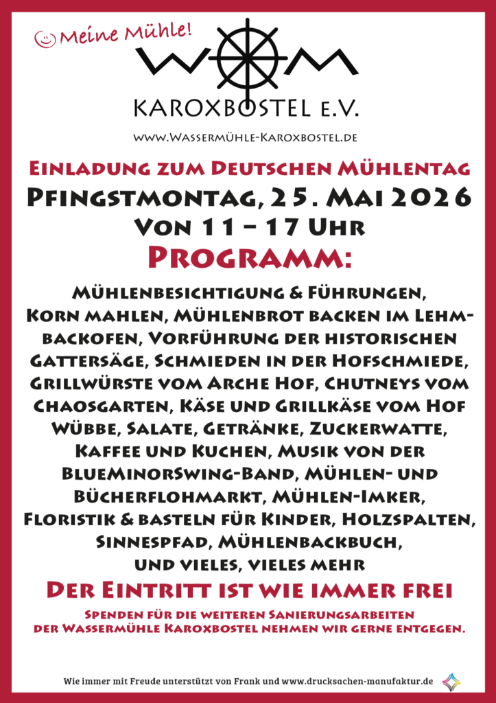 Zu einem fröhlichen Fest rund um die historische Mühle lädt der Verein Wassermühle Karoxbostel e.V. ein: Gefeiert wird am Pfingstmontag, 25. Mai 2026, von 11 bis 17 Uhr. Der Eintritt ist frei.