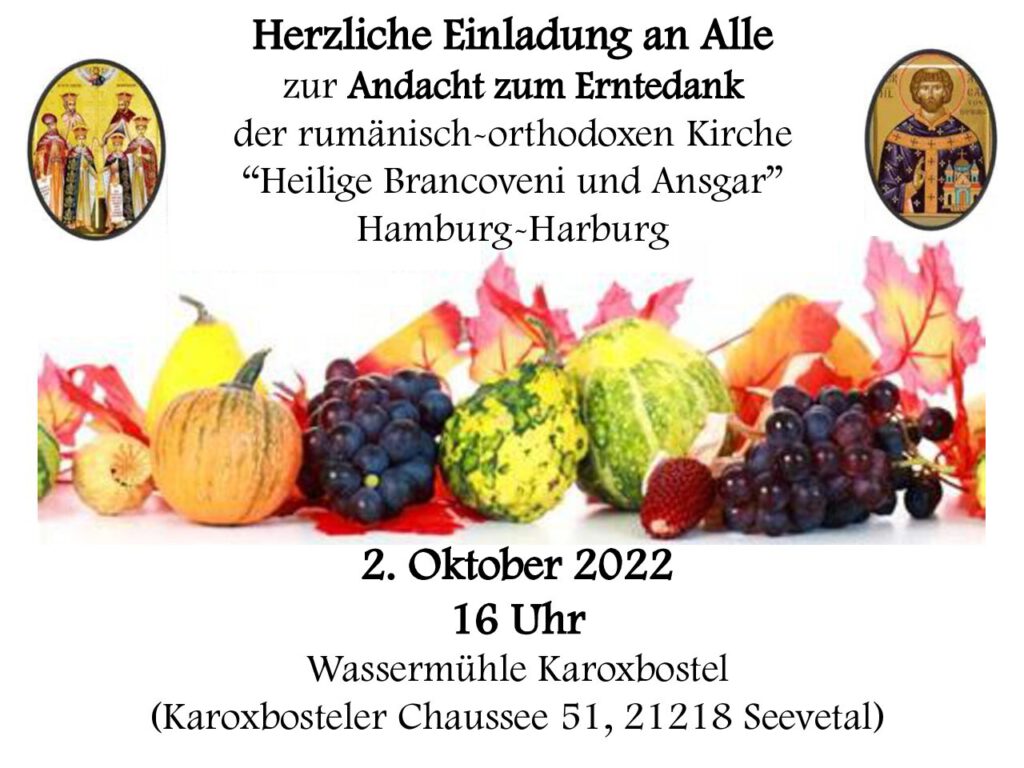 Herzliche Einladung an Alle zur Andacht zum Erntedank der rumänisch-orthodoxen Kirche „Heilige Brancoveni und Ansgar” Hamburg-Harburg