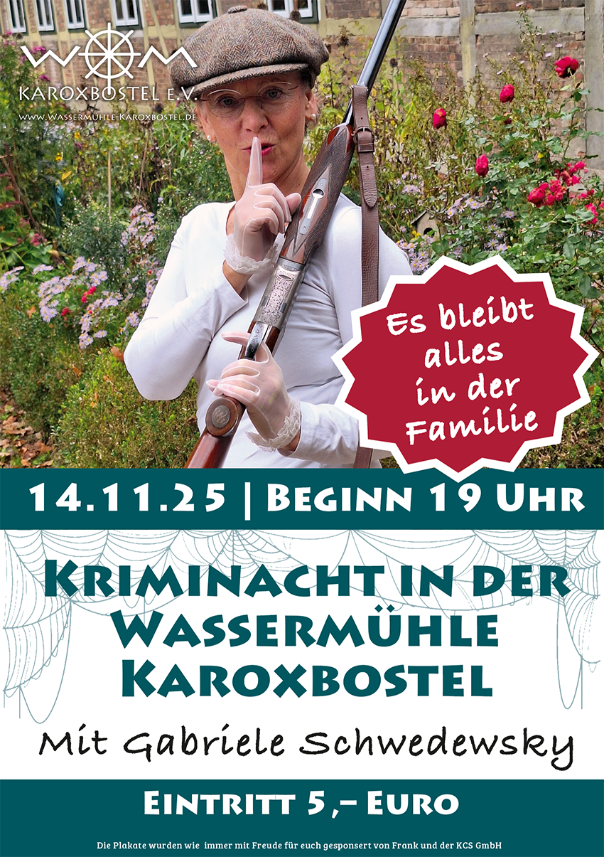Krimi-Fans dürfen sich wieder auf knisternde Spannung und schwarzen Humor freuen: Unter dem Motto: „Es bleibt alles in der Familie“ entführt Gabriele Schwedewsky ihre Zuhörer bei der 9. Karoxbosteler Kriminacht am Freitag, 14. November, wieder in die dunkle Welt des Verbrechens. Ab 19 Uhr ist mörderisch gute Unterhaltung in der historischen Wassermühle Karoxbostel an der Karoxbosteler Chaussee 51 garantiert. Am prasselnden Kaminfeuer in der Tenne des 200 Jahre alten Bauernhauses geht es diesmal um toxische Beziehungen in der Familie. „Und guten Freunden ist auch nicht immer zu trauen“, sagt Gabriele Schwedewsky und lächelt maliziös.