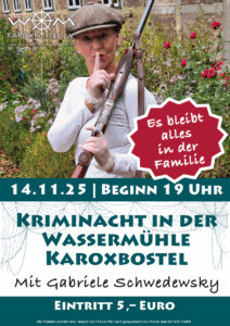 Das gesamte Karoxbosteler Mühlen-Team freut sich auf Ihren Besuch und wünscht Ihnen schon heute einen unterhaltsamen Krimi-Abend an der Wassermühle Karoxbostel.