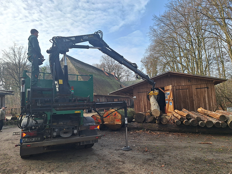 Carsten Meyer, Inhaber eines Seevetaler Gartenbaubetriebes, hat am Samstag mit seinem Lkw drei große Hainbuchenstämme angeliefert, die er der Mühle gespendet hat. Das Holz ist sehr hart und haltbar und wird im Mühlenbau für besonders stark beanspruchte Kämme (Zähne) und Keile verwendet. Wir freuen uns über die tolle Sachspende und sagen „vielen Dank!“ Ebenso herzlich bedanken wir uns bei Kim Koppermann, der am Samstag zwei Lkw-Ladungen Kompost gebracht hat, die die Firma Koppermann der Mühle gespendet hat.