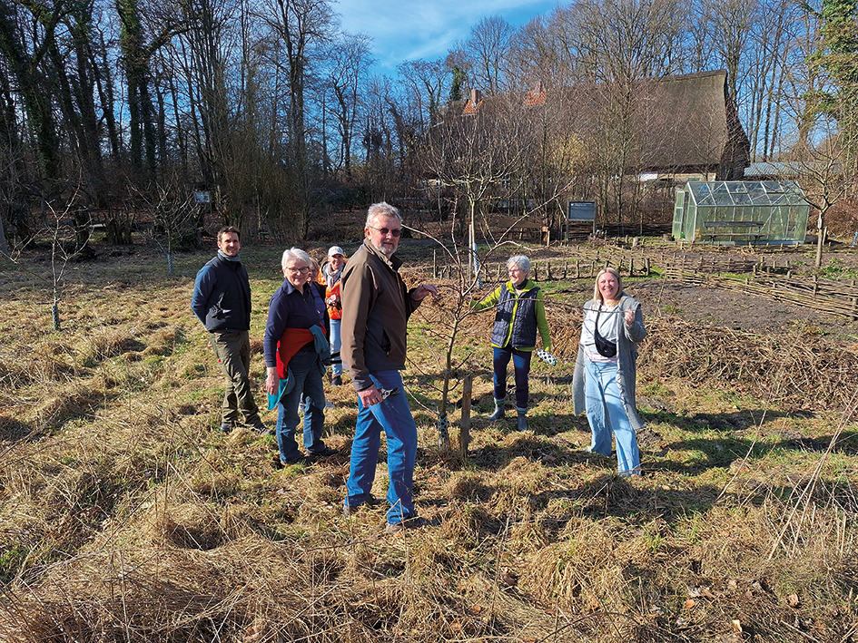 Anschließend hat Willy in Doras Garten allen Interessierten gezeigt, wie Obstbäume richtig beschnitten werden (Foto). Am Dienstag haben Bernd und Carsten in der Sägerei gearbeitet und vor der Sägerei ein paar Lärchenstämme geschält. Die Säge ist soweit eingerichtet, dass wir beim Mühlenputz Kanthölzer und Bretter sägen können.